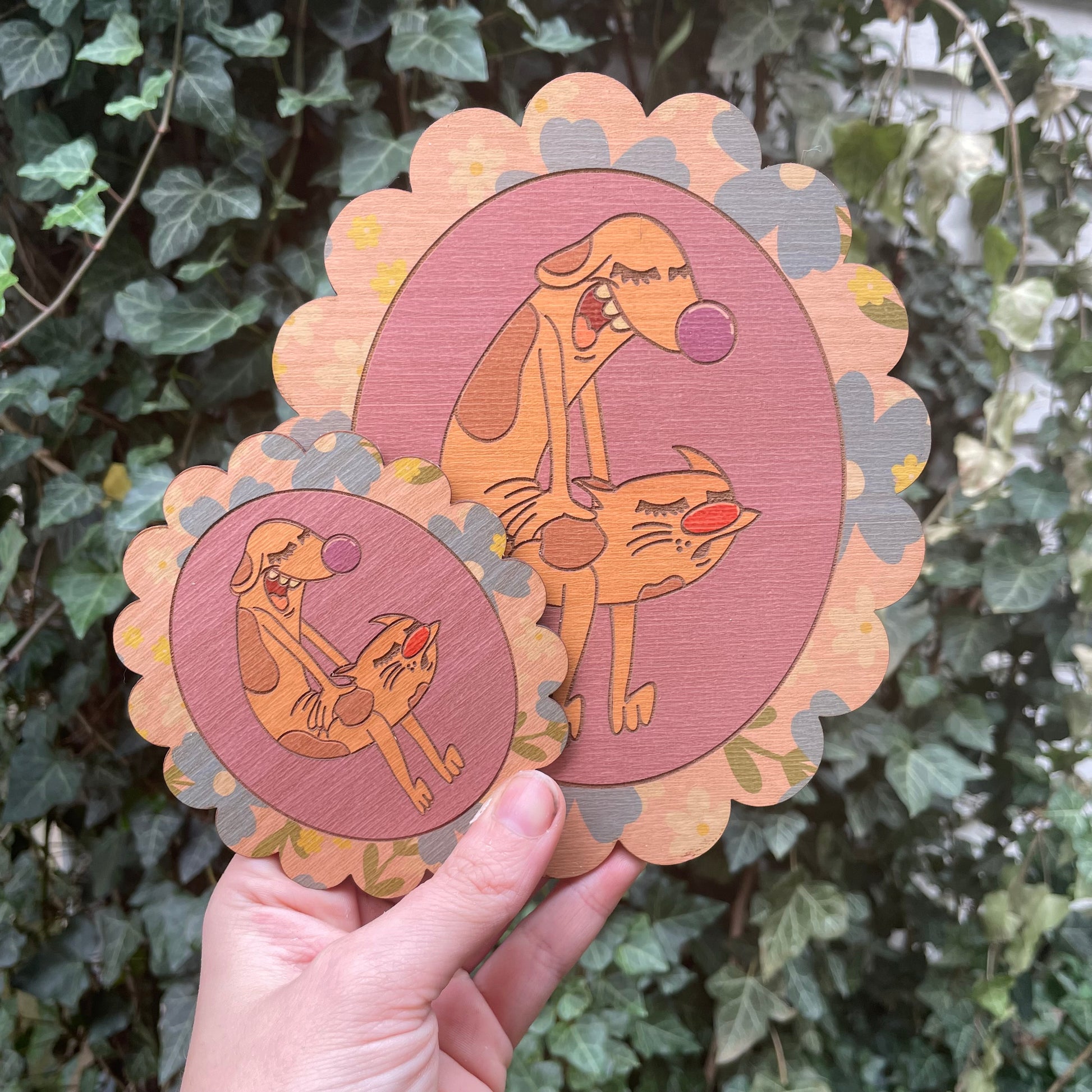 These maple wood wall hangings feature hand-drawn characters that have been sublimated onto a faux wood surface. Choose from a large size at 7”x6” or a small size at 4.25”x3.7”. Plus, we've even included a command strip for easy hanging!