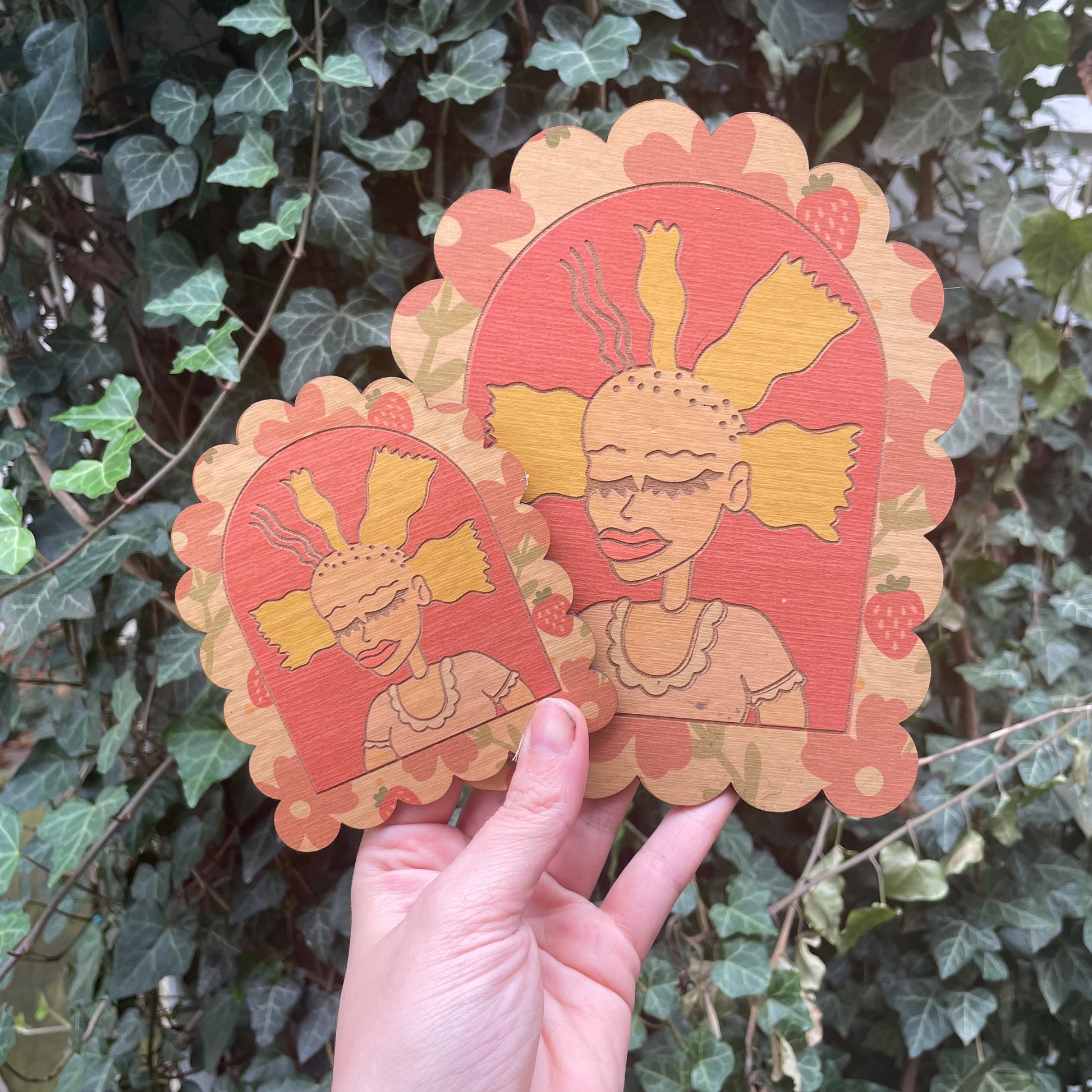These maple wood wall hangings feature hand-drawn characters that have been sublimated onto a faux wood surface. Choose from a large size at 7”x6” or a small size at 4.25”x3.7”. Plus, we've even included a command strip for easy hanging!